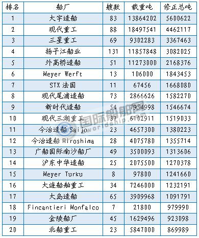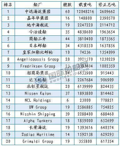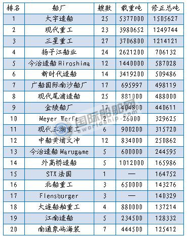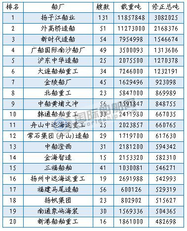 新签订单量排名前20船厂