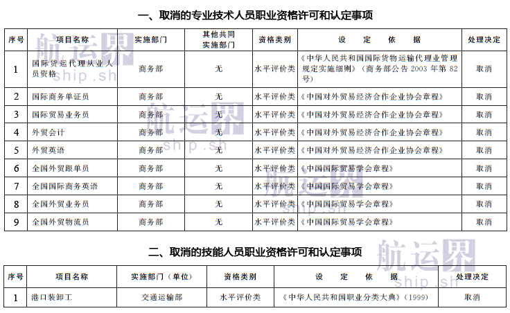 航运界网消息,7月24日国务院发布《关于取消一批职业资格许可和认定事项的决定》 航运界网从其网站整理了有关于航运业中取消的相关职业资格许可证。